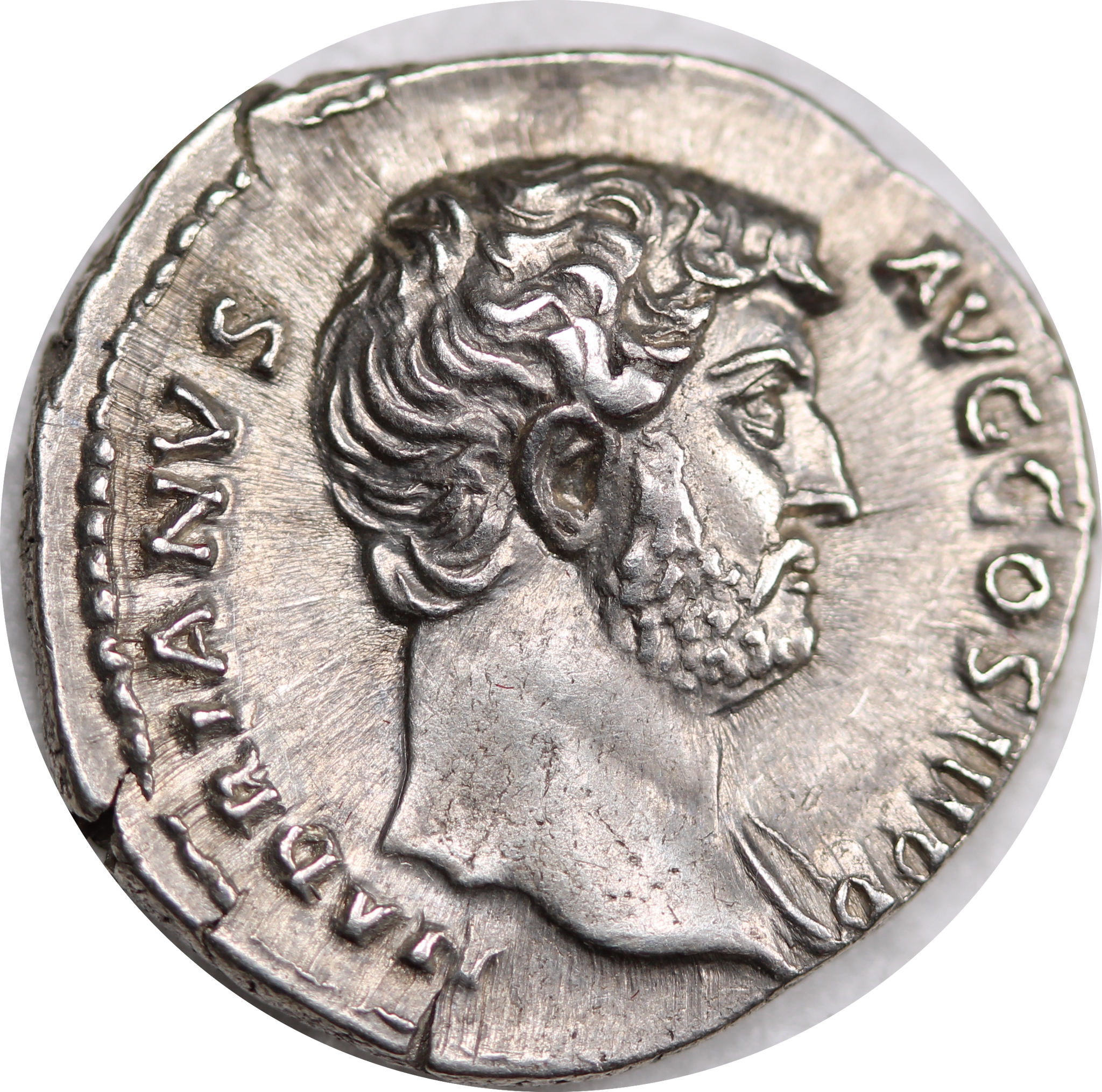 This silver denarius was struck under the reign of Emperor Hadrian (AD 117–138) at the Rome mint. The obverse features a finely rendered, bare-headed and draped bust of Hadrian facing right. Surrounding the portrait is the inscription HADRIANVS AVG COS III PP, which translates to "Hadrian Augustus, Consul for the third time, Father of the Nation." This legend emphasizes Hadrian’s established role as a seasoned and respected ruler by the time of this issue. The bust is executed in the high style typical of the period, with lifelike detail that reflects the emperor’s reputation as a cultured, intellectual leader.
