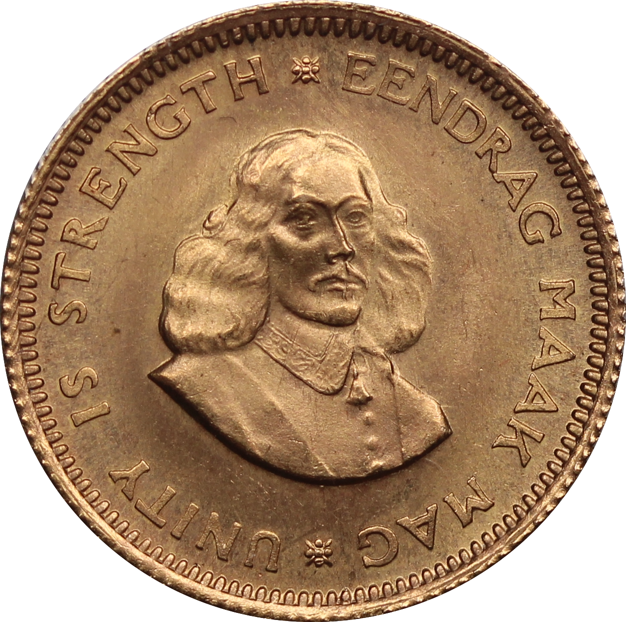 The 1976 South Africa 1 Rand gold coin features a portrait of Jan van Riebeeck, founder of Cape Town, on the obverse. The reverse displays a springbok antelope, a national symbol. Struck in 22-carat gold, it was issued during South Africa’s apartheid era.