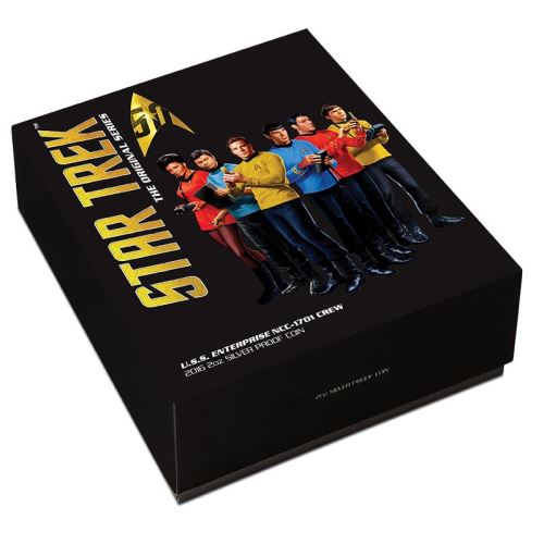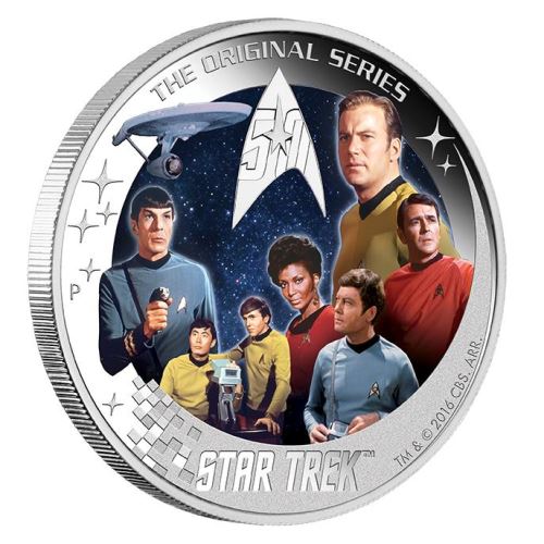 To celebrate the 50th anniversary of the cultural phenomenon that is Star Trek: The Original Series, The Perth Mint is excited to release this awesome silver coloured coin featuring members of the starship U.S.S. Enterprise NCC-1701.