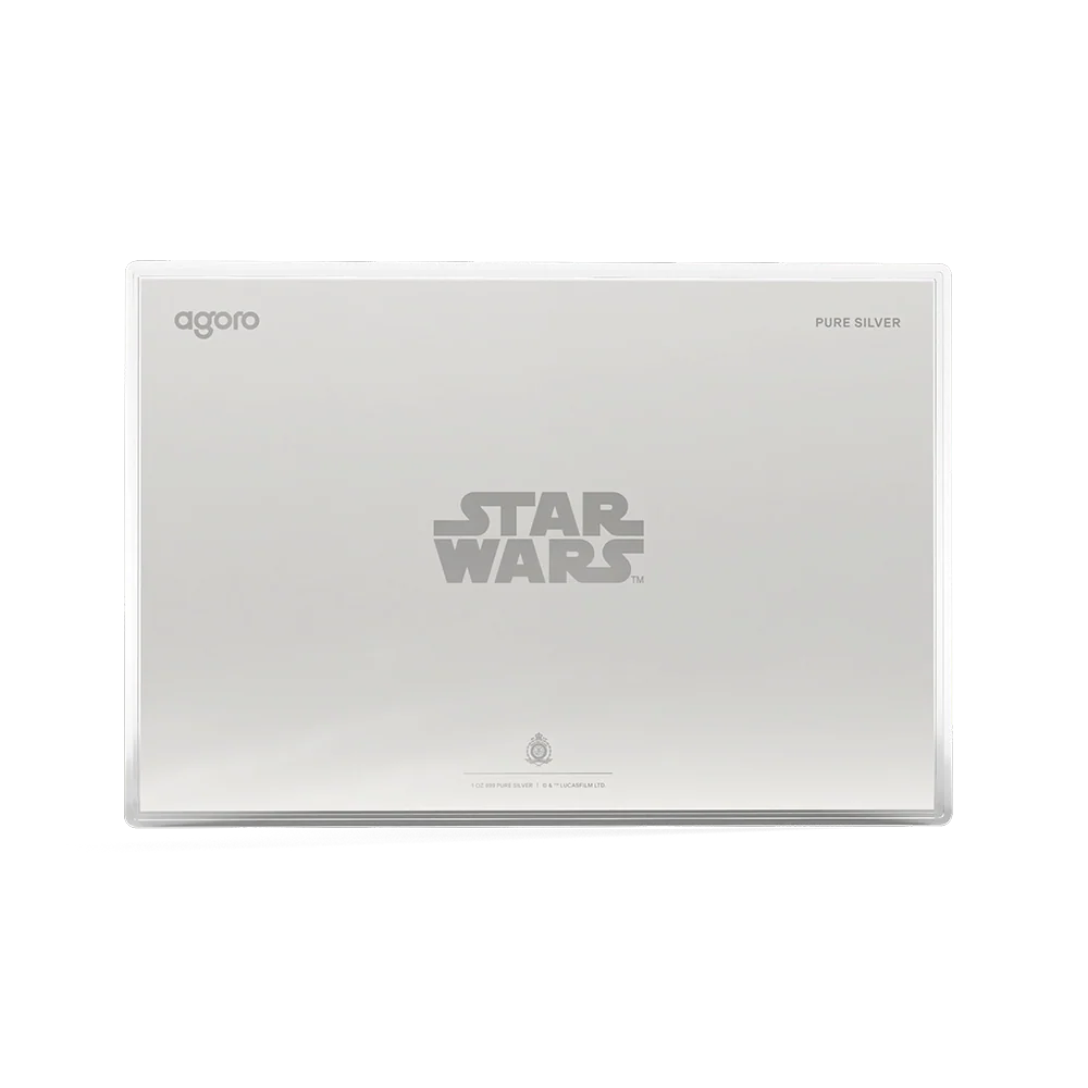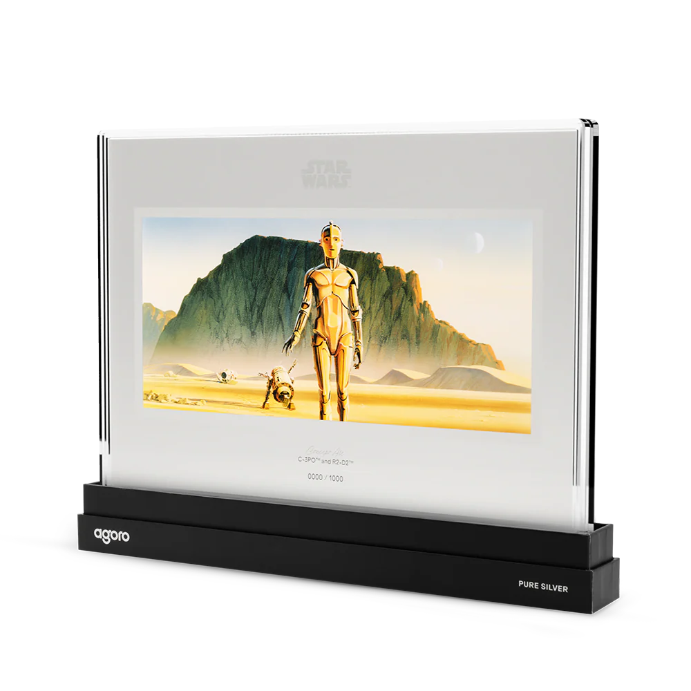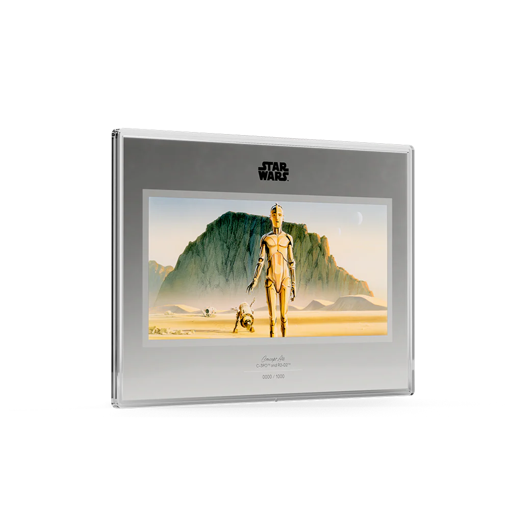 This 1oz 999 pure silver collectible is the third release in Agoro’s Star Wars™ Concept Art Series, featuring C-3PO™ and R2-D2™ journeying across a vast desert landscape. Presented in a landscape, poster-style design, the foil captures the Star Wars concept art that shaped the galaxy far, far away. The artwork blends a sketch-inspired artstyle with frosted silver textures, and a refined metallic border.