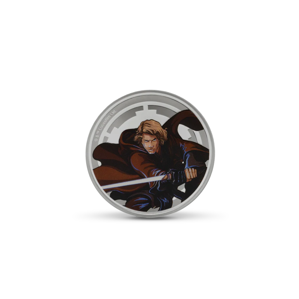 - Double-sided collectible features Anakin Skywalker on one side with the Imperial crest behind.