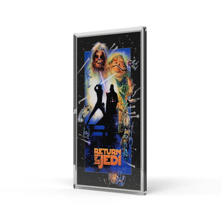 The third and final release in our STAR WARS™ Original Trilogy Poster series captures the legendary 1983 film in 1oz of 999 pure silver foil. A striking silhouette of Luke Skywalker™ and Darth Vader™ locked in a duel, accompanied by Leia™, Chewbacca™, R2-D2™, and more adorn the design. Struck on silver bursting with retro energy, and framed by a mirror-polished galaxy. A worthy finale of our original trilogy alternative art poster series.