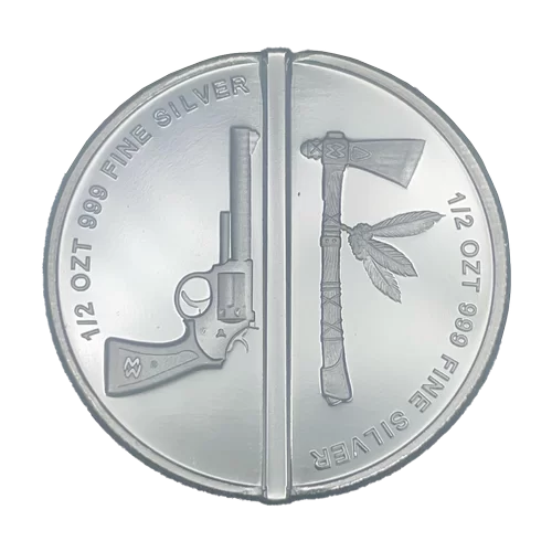 The obverse features a split image: a rugged cowboy on one side and a dignified Native American chief on the other. The reverse continues the theme, with a revolver on the cowboy’s side and a tomahawk on the chief’s.